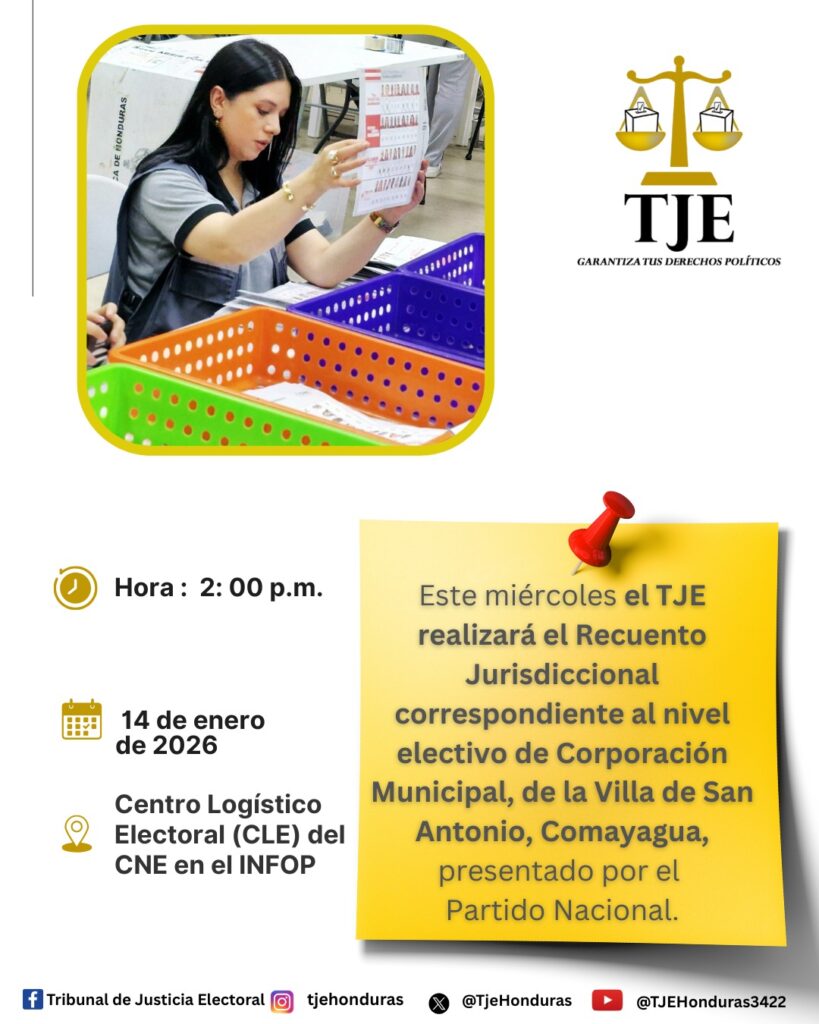 Este miércoles el TJE realizará el Recuento Jurisdiccional correspondiente al nivel electivo Corporación Municipal, de la Villa de San Antonio, Comayagua, presentado por el Partido Nacional.