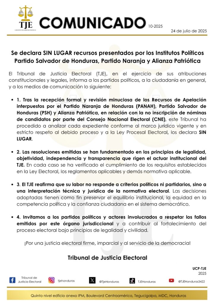 Se declara SIN LUGAR recursos presentados por los Institutos Políticos Partido Salvador de Honduras, Partido Naranja y Alianza Patriótica.