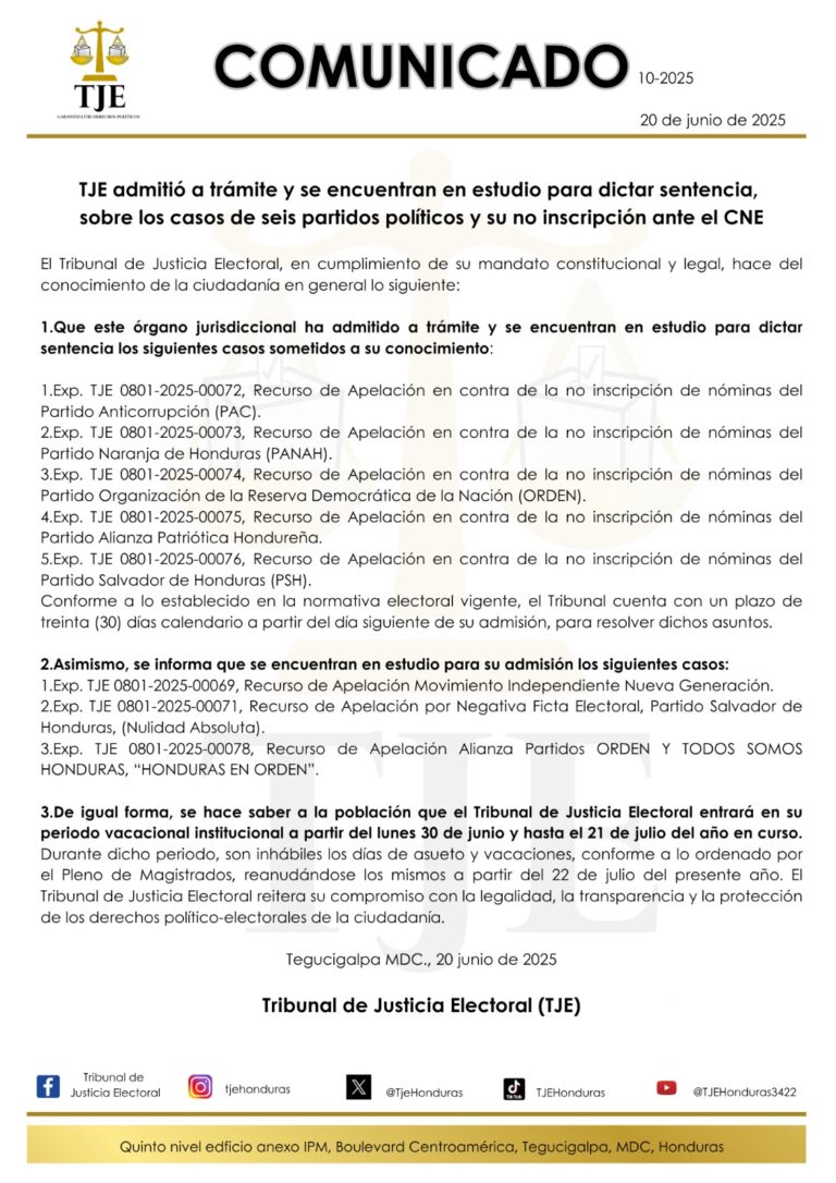 TJE admitió a trámite y se encuentran en estudio para dictar sentencia, sobre los casos de seis partidos políticos y su no inscripción ante el CNE